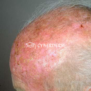Sun-exposed areas (scalp, face, back of hands, shins, forearms).
