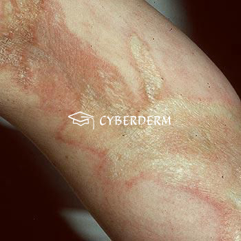 Interface dermatitis in early phases with varying intensity of inflammatory cellular infiltrates and changes of collagen structure depending on time of the disease course. Identical to progressive systemic sclerosis (see there).