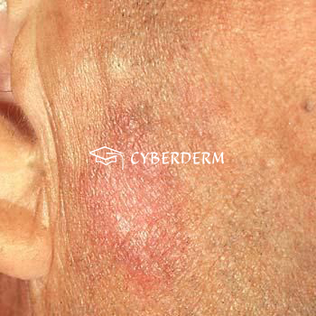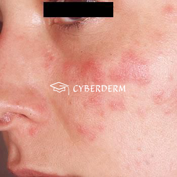In discoid lupus erythematosus persistent several mm to cm sharply bordered, sometimes confluent, and painful lesions with triad of erythema, follicular keratotic plugs, and atrophy (each of which can dominate clinical picture). In systemic LE butterfly rash. Non- specific changes include erythematous maculopapular exanthema, diffuse hair loss, Raynaud syndrome, livedo racemosa (anticardiolipin antibodies and others) as a sign of cutaneous vasculitis, can all be present.