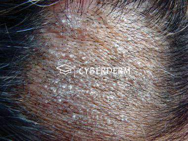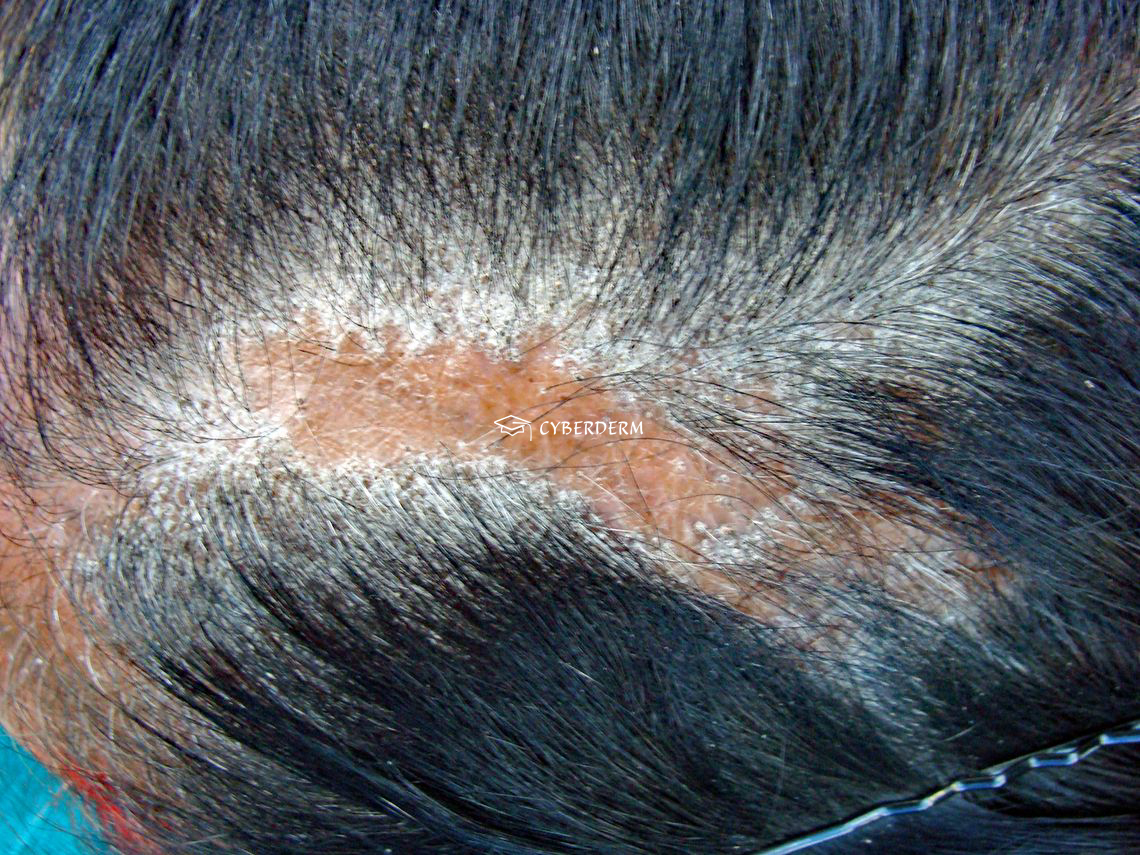 Coin or disk-shaped erythematous plaques with follicular hyperkeratosis and a tendency to heal with scarring, usually on light-exposed areas or scalp (acquired, circumscribed scarring alopecia).
