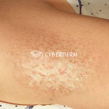 - Radiation dermatitis features a relatively well-circumscribed atrophy of the