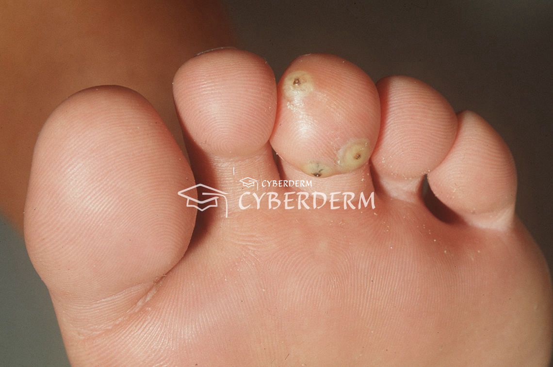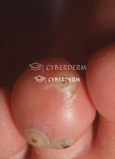 Mostly on the nail rim: itchy, and painful lesions due to fissuing, hindering from normally walking; foreign body-sensation. Superinfection leads to formation of pustules, suppuration and ulcers. Expelled eggs and the release of brownish threads of faeces are pathognomonic signs.