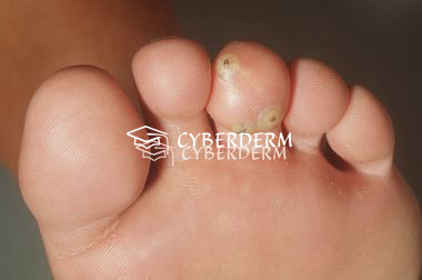 Preferentially but not exclusively on feet, toes, under the toenails, and interdigital sites.