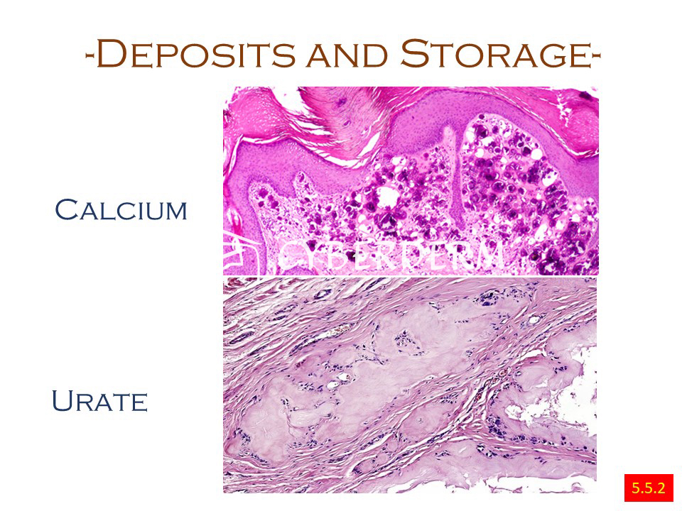 5.5.2 Other deposits: Melanin, lipids, urate, mucin, iron (hemosiderin), porphyrins, calcium and other organic or inorganic substances, produced during pathologic disease processes may be deposited intracellularly (macrophages) or extracellularly between or attached to collagen bundles in the dermis.