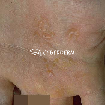Tiny pruritic, fluid-filled vesicles or bullae on palms and soles. Patients often report pruritus as the first symptom, then tiny vesicles become visible, later followed by erythema and scaling.
