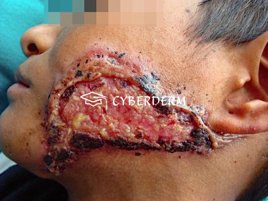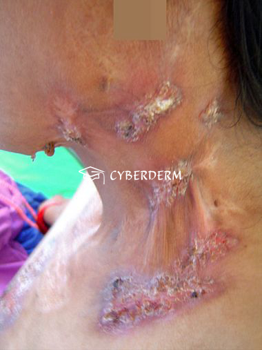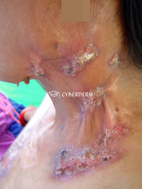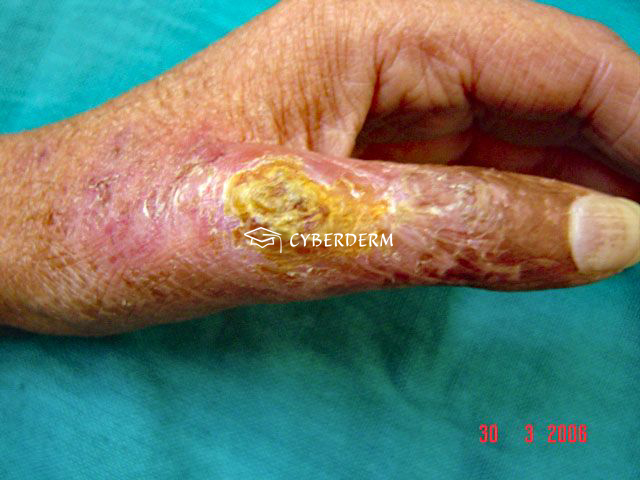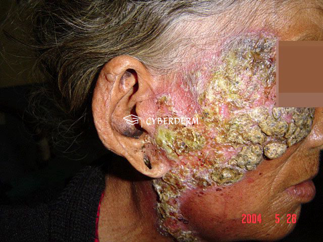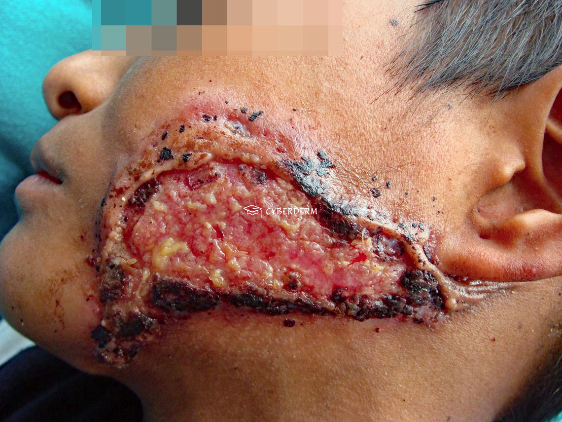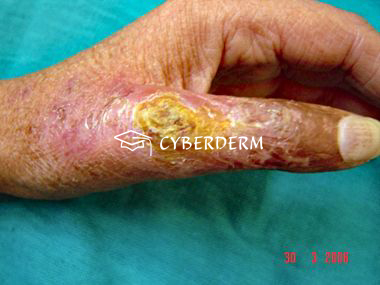 Ulcerations, scaring, mutilations or systemic spread, squamous cell carcinoma on chronic skin ulcers.